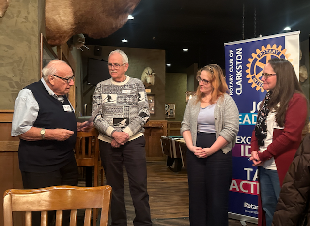 At Monday's meeting, DGE Lee Halsted helped us welcome our newest member, Shannon Carter. Shannon, a mental health professional, is no stranger to Rotary having spent time in Ukraine as a Rotary Peace Fellow. We're looking forward to hearing details about her unique personal experience with a program we've only read about. Lee was joined in the presentation by sponsor Jeff Lichty and President-elect Stephanie Banks. Thanks to Lee and his wife Lois for helping us Clarkston Rotarians celebrate!